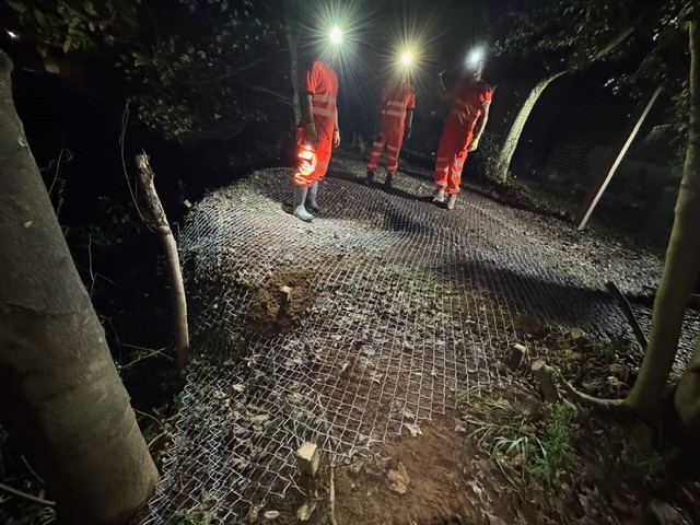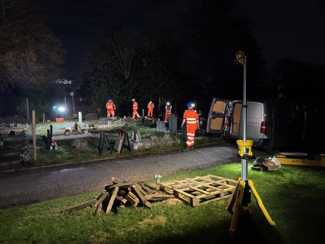 Work was completed at night, coordinated to respect cemetery visitors and memorials, and measures were implemented to protect the public from operational machinery. Close liaison with the railway operator ensured safe access, exclusion zones, high-visibility signage, and restricted working times near the tracks.